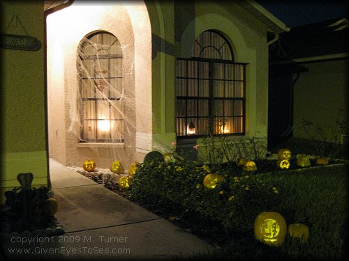 Here's the outside decorations. Couple tombstones, webbing, candles in the window and of course, pumpkins!
