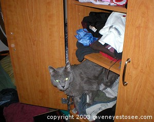 ![]() I opened up my dresser to add some laundry and while my back was turned, I caught him laying on my clothes. |